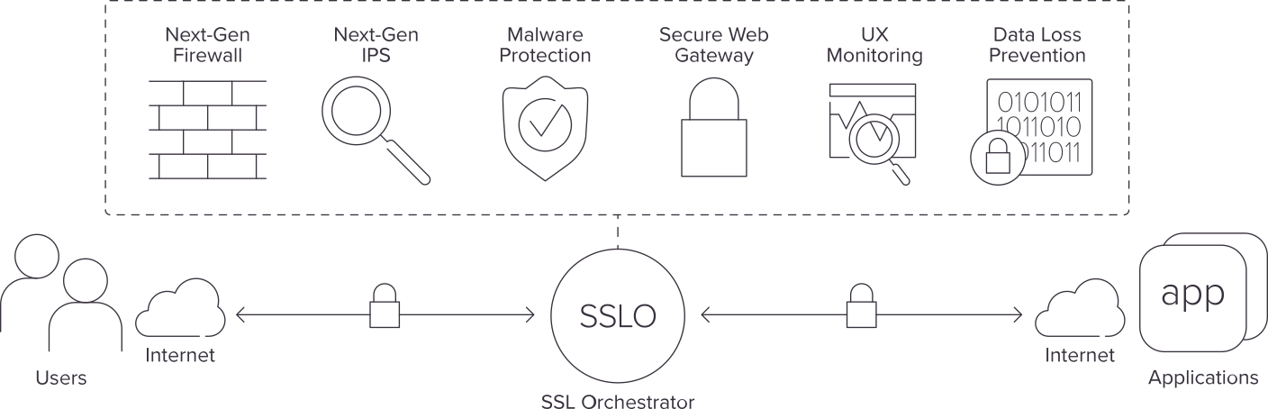 SSL Orchestrator memaksimalkan investasi infrastruktur, efisiensi, dan keamanan dengan dekripsi berbasis kebijakan, enkripsi, dan pengarahan lalu lintas yang dinamis melalui beberapa perangkat inspeksi.